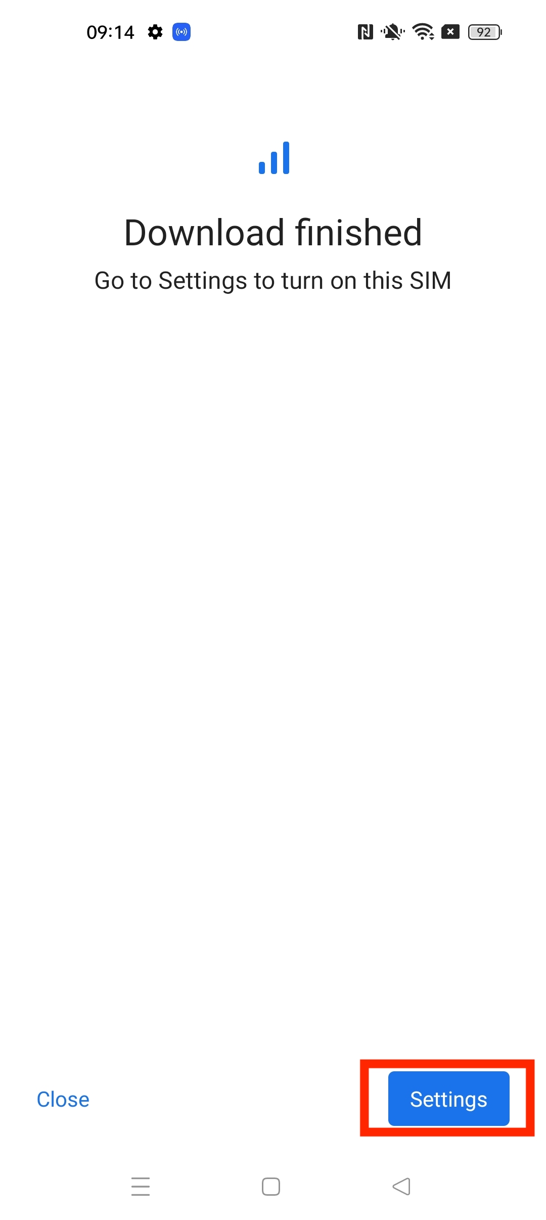 8. Wait for the eSIM to be installed. > Press "Settings".