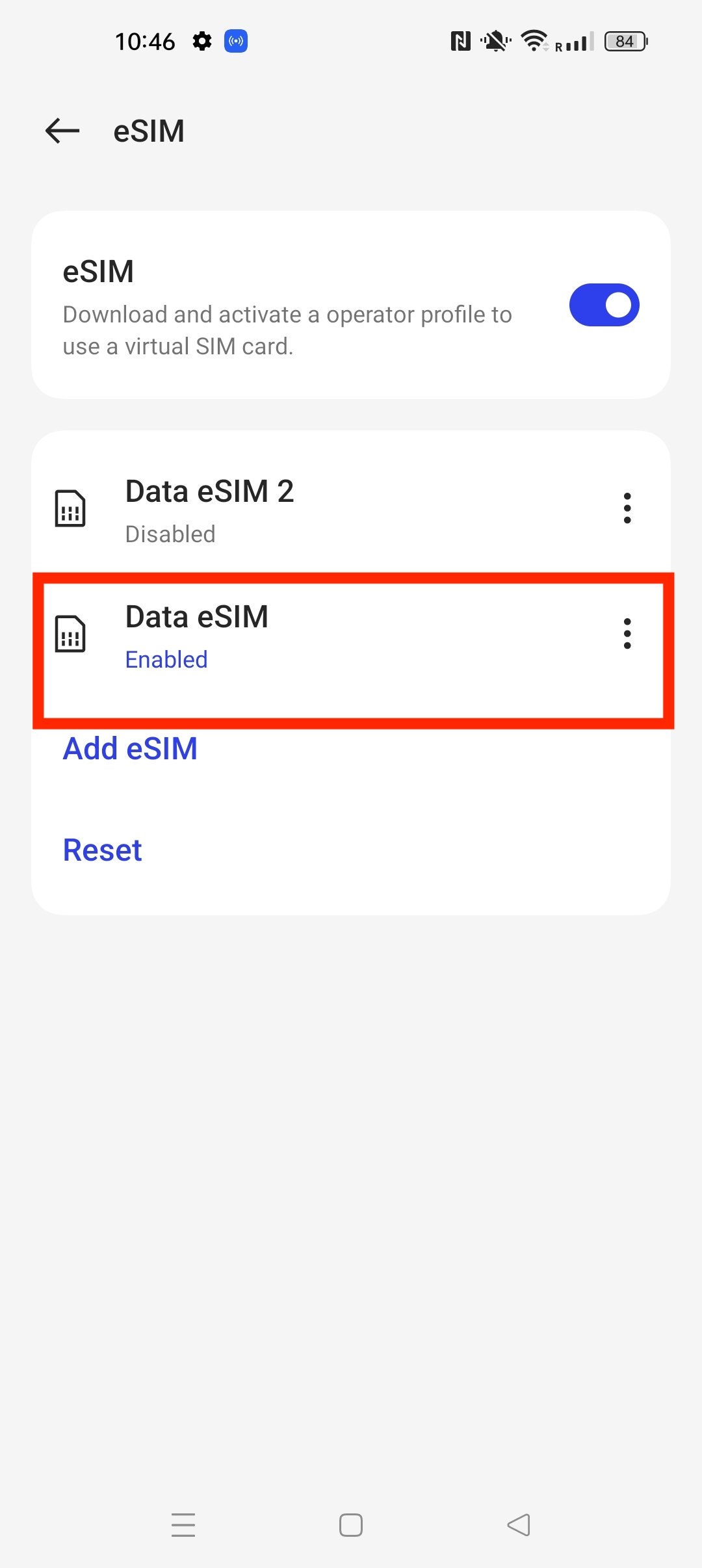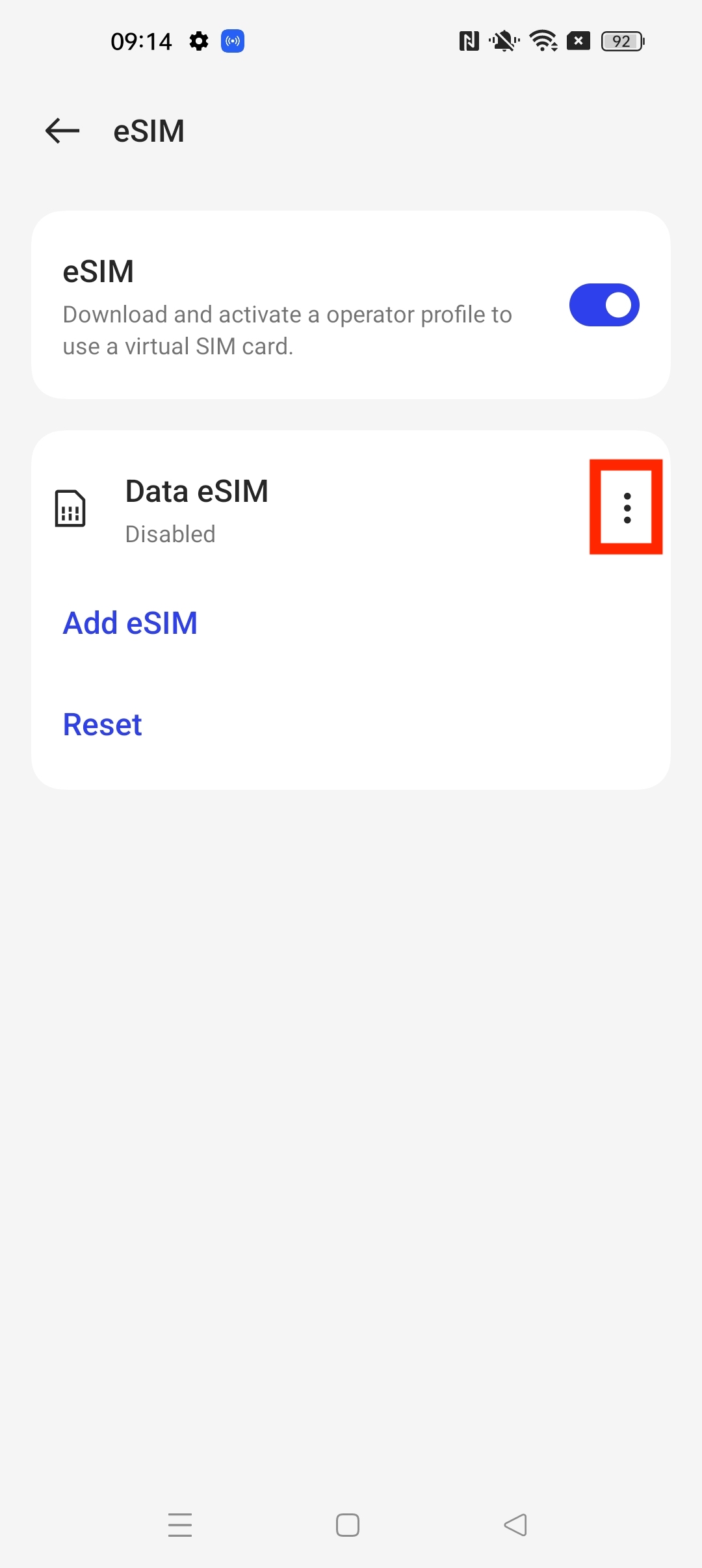 10. Ensure your eSIM is enabled by clicking the three dots on the right-hand side > "Enable" > "Yes".